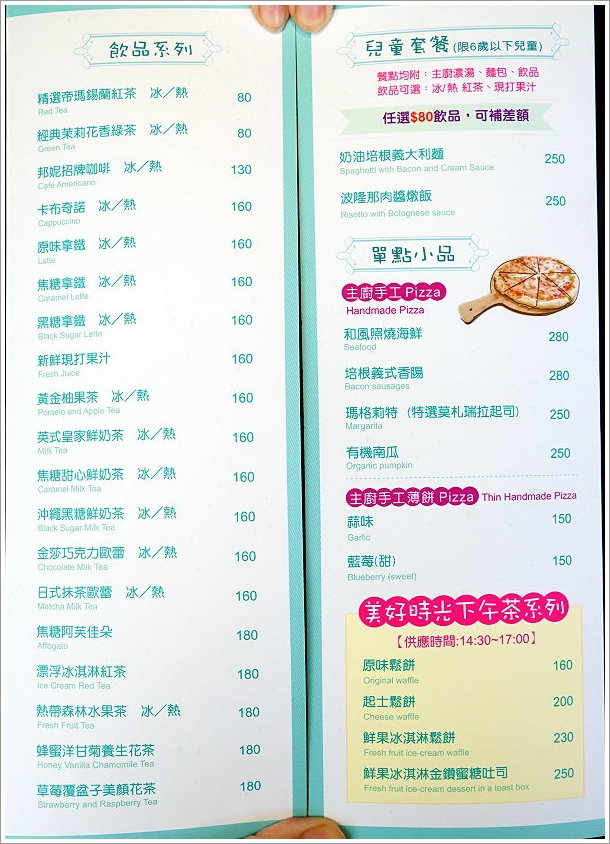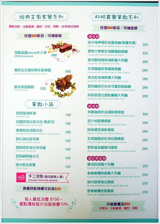 ▼邦妮義饗世界菜單,有主廚套餐、單點小品、手工甜品、義大利麵、燉飯、蛋奶素食類、兒童套餐、手工PIZZA、薄餅PIZZA、下午茶、飲品等,選擇還不少!
