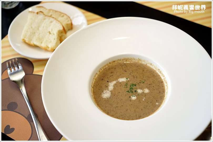 ▼因為點主廚套餐均有附主廚濃湯、沙拉、甜點、冰/熱美式咖啡(可任選80元飲品,可補差額)!所以我們的附餐就先上桌囉~首先享用的是松露蘑菇湯、自製麵包,看起來份量還不少,滿有誠意的!