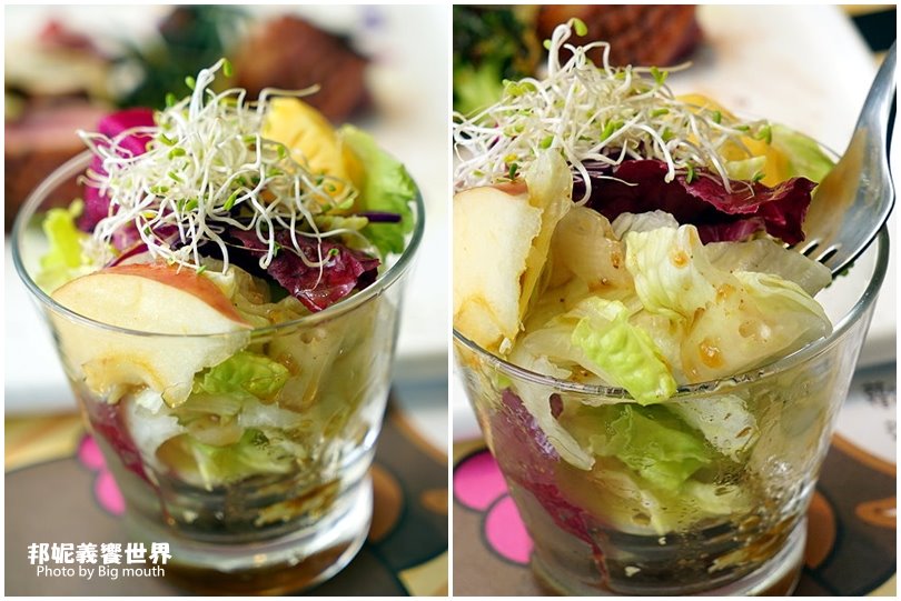 ▼和風沙拉,裡頭不僅有多樣新鮮生菜、水果,搭配和風油醋醬吃起來微微酸香甜美,爽脆又開胃,加上當季水果香甜又美味,一整個豐富又多元!