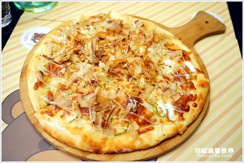 ▼和風照燒海鮮PIZZA(280元),PIZZA麵皮可是店家特別採用日本麵粉自行手工製作,再搭配花枝、蔬菜、柴魚片等配料下去現烤而成,一上桌就聞到濃濃香氣!
