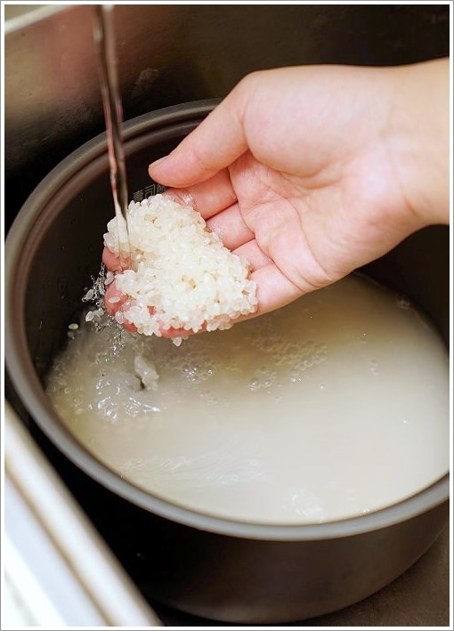 ▼接著就要來炊飯啦!首先我們先來洗米,用輕揉畫圈的方式掏洗,洗個2~3次即可,記得不要太用力免得米粒破碎後口感會沒這麼好!接著將米洗淨後浸泡最少2小時,或是像我們一樣先放入冰箱泡過夜,讓米粒吸飽水,這樣吃起來米的黏性也會更好!