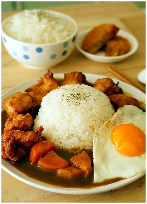 ▼我們將煮好的白米搭配最愛的日式咖哩,配上炸雞唐揚與荷包蛋就是美味又豐盛的一餐啦!