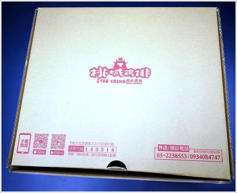 ▼第二次大口又跟口咩來嘉義住飯店,想說上次吃到的「桃城雞排」相當好吃,想說再來訂餐,殊不知現在有最新的「桃樂雞」(530元/隻,需預訂),不然來訂訂看,沒想到來的時候竟然是一大箱啊!