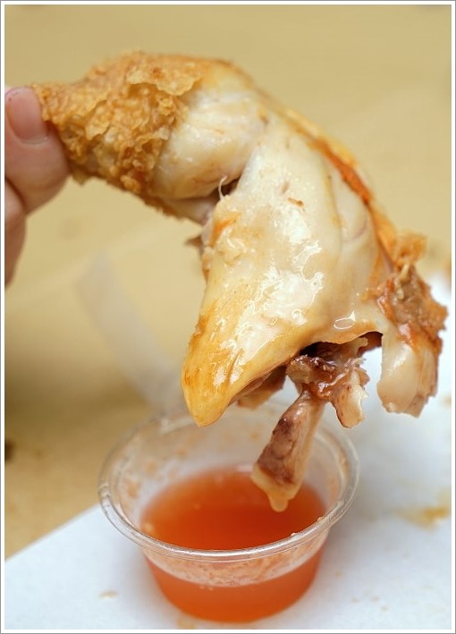 ▼終於把雞腿完整取下啦!趕快來咬一口嚐嚐~吃起來肉質軟嫩香Q,甜美又多汁,帶有微微的醃料香氣,搭配外頭酥脆的雞皮,整口咬下真是超級過癮!