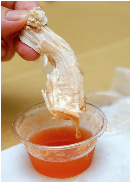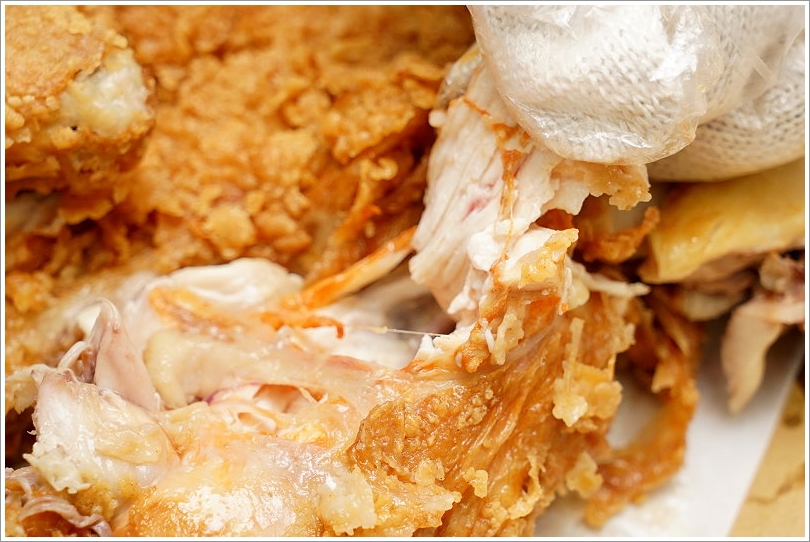 ▼大家都知道全雞最怕雞胸的部份很乾柴,接下來我們就來品嚐看看炸全雞的雞胸好不好吃囉!撕開的同時看起來還滿濕潤的,讓我們更期待它的美味~