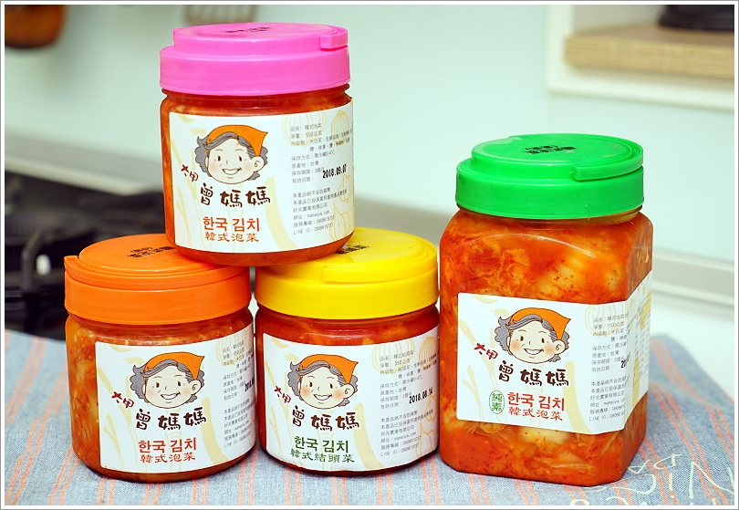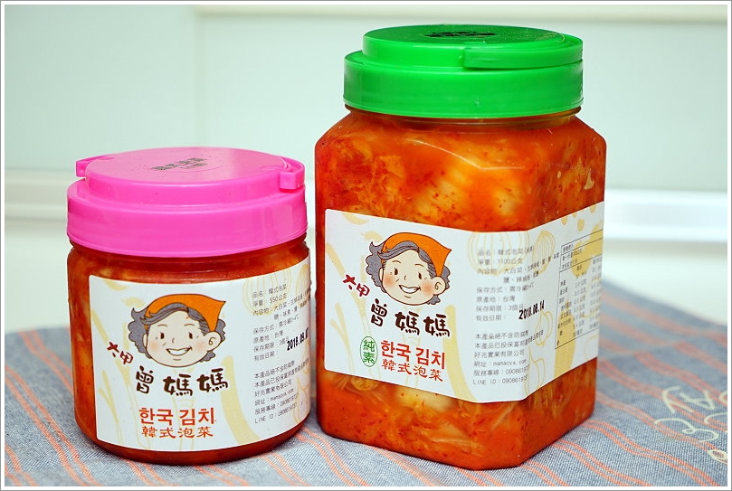 ▼「大甲曾媽媽韓式泡菜‧結頭菜」目前分為大罐(1100g)、小罐(550g)兩種尺寸,大罐的有韓式泡菜(小辣、中辣、大辣、素食小辣、火鍋泡菜中辣)、結頭菜(小辣);小罐的有韓式泡菜(小辣)、火鍋泡菜(中辣)、結頭菜(小辣),不管是送禮或是自己享用都很適合!