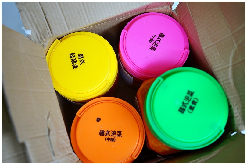 ▼收到的時候是以箱子盛裝、黑貓冷藏宅配到家,裡頭一共有四罐商品,分別為韓式結頭菜(550g)、韓式泡菜(小辣/550g)、火鍋泡菜(中辣/550g)、韓式泡菜(素食/1100g),並且以瓶蓋顏色做區別,讓人更方便辨識!