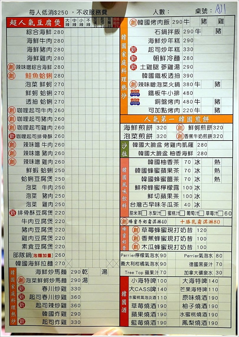 ▼點單,除了有招牌的豆腐煲之外,還有家庭料理、熱炒、煎餅、沙拉、飲料、韓國酒等,還可以調整辣度與增加配料,選擇還不少!(未滿十八歲請勿飲酒)