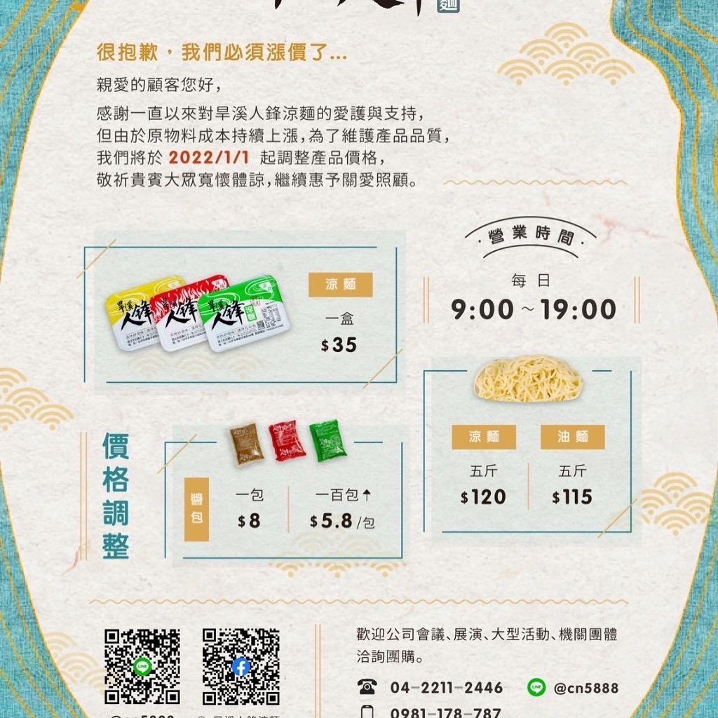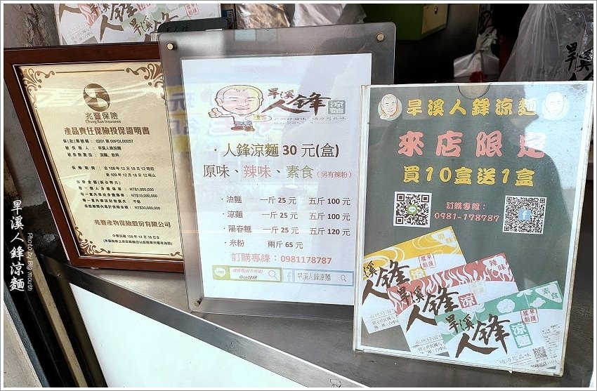 ▼「人鋒涼麵」以前一盒25元,現在小漲5元變成30元,對北部人來說還是很便宜XDD現在還有買10盒送1盒的優惠,難得來一趟當然要一次買10盒才划算(笑)!另外也有販售自家生產的油麵、涼麵、陽春麵、冬粉等,有需要的朋友都可以直接跟店家訂購! (2022年再訪時,目前每盒已經調整為35元)