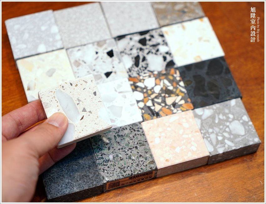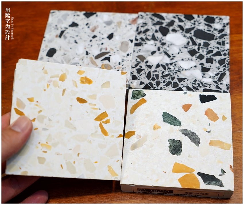 ▼現場還有最現在很流行的水磨石,目前很多都用於商業空間,但其實用於居家空間看起來也很吸睛,通常用於電視牆面、檯面或是中島的石材居多!這裡使用的水磨石是採用義大利進口,處理工法就跟大理石差不多,但價格比大理石還要低一咪咪,不僅花色比較花俏,而且價格也很有競爭力!