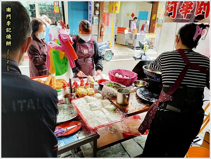 ▼「南門李記燒餅」對面就是同樣熱門的早餐林記水煎包、故鄉の味麵糊蛋餅,這裡不管平日、假日總是排了滿滿的人潮,門口左邊是現擀現煎的蛋餅區,右側則是現炸油條區;店內的右側就能看到師傅在現擀現做的招牌燒餅,也是結帳的地方,店內左側則是豆漿區,排蛋餅的時候順道買即可!第一次來的朋友應該不太知道如何點餐,建議大家先到右側燒餅區拿取燒餅,並說明購買的品項、結帳,再繞到左邊豆漿區拿豆漿(需要的話),再往前點蛋餅,排隊路線呈現一個倒U字型、由右而左就對啦~當然如果沒有要買燒餅的朋友也可以直接省略,但通常來到這裡的朋友大多是為了燒餅而來的(笑)!