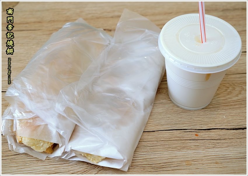 ▼我們買了一個燒餅加蔥蛋、一個燒餅加蛋餅、一杯甜豆漿、心滿意足的回家享用!裡頭其實也有內用區,但座位數不多,通常都是滿的,加上排隊的人潮踴躍,所以還是帶回家吃比較舒服!他們家的豆漿帶點微微炭燒味,甜度不會過高,香醇滑順,我們都很喜歡!