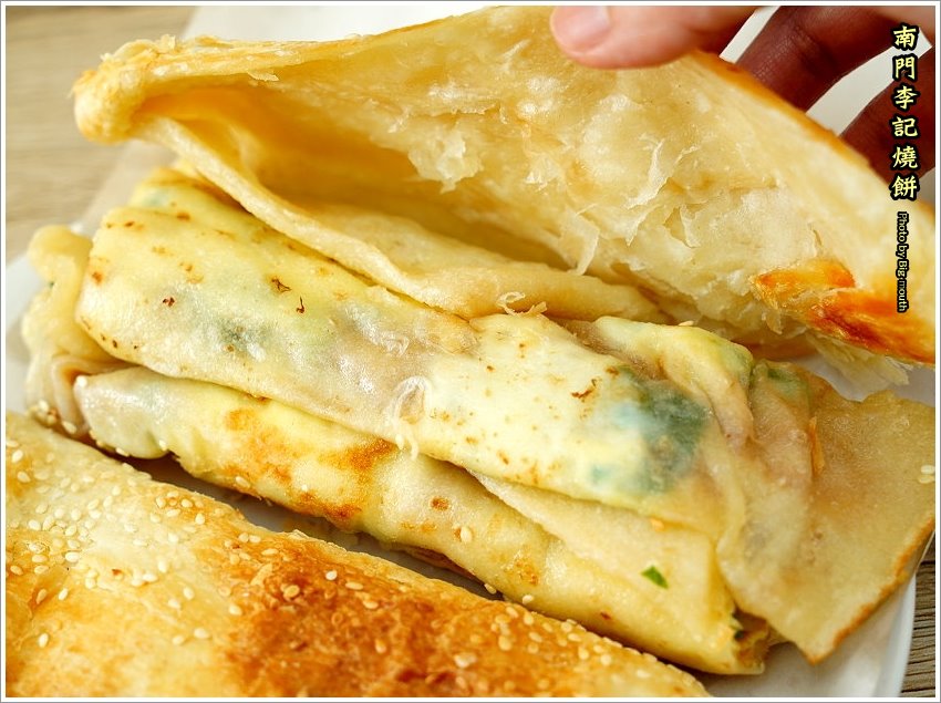 ▼燒餅加蛋餅也是我們超推的一款,大胃王的朋友一定要來一份!薄酥香脆的餅皮搭配柔滑中帶點Q勁的蛋餅,不僅有迷人的麵香、芝麻香與爐烤香氣,搭配蛋餅的麵皮香Q、蔥花、嫩蛋的組合,雖然份量十足,吃起來卻讓人一口接一口停不下來,怎麼會這麼好吃!