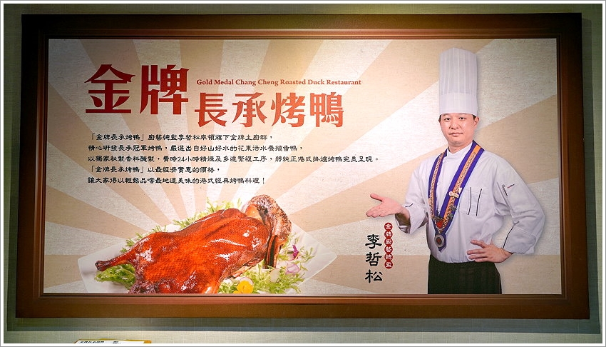 ▼「金牌長承烤鴨」由廚藝總監李哲松所掌杓,李哲松主廚不僅擁有20多年粵菜料理的經驗,還屢屢獲邀為政商名流、國際外賓掌廚,其中更是獲獎無數、深獲肯定,還有「金牌廚神」的封號,聽起來就很厲害啊!