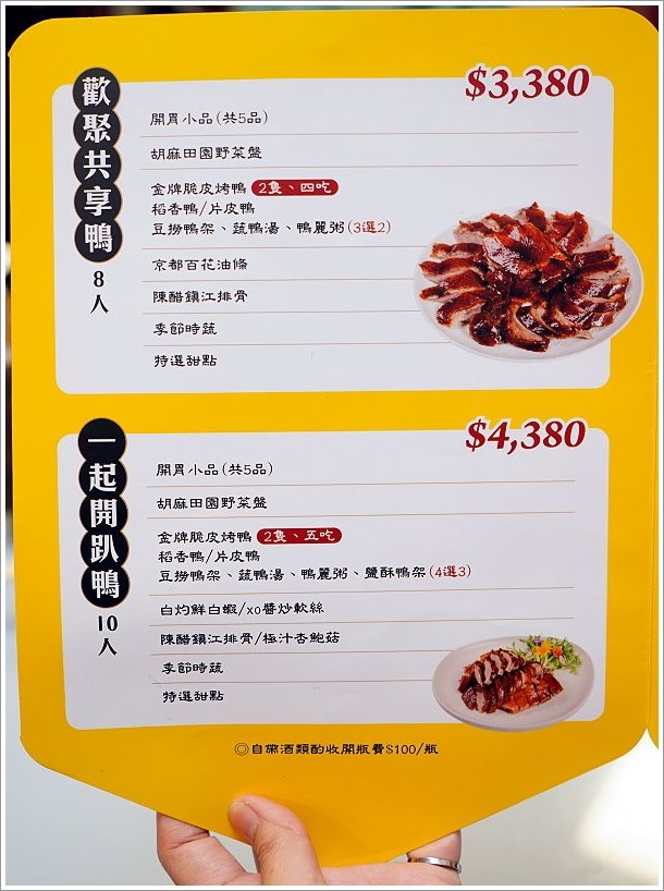 喜愛吃烤鴨的朋友有福啦!位於新北市新莊區龍安路上的「金牌長承烤鴨」,是由知名主廚李哲松所掌杓,不僅推出稻香鴨、片皮鴨、豆撈鴨架、鹽酥鴨架、蔬鴨湯、鴨麗粥、麻辣鴨架、鬼椒鴨架等一鴨八吃的多元創意吃法,還有4~10人不等的組合套餐,而且10人份算下來每人只要500元有找,還能吃到2隻烤鴨、5種吃法,真的很超值!另外也有推出外帶組合,精美盒裝好看又好吃,開幕期間也有推出送100元折價券的優惠唷!