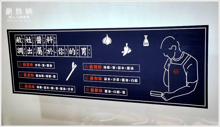 ▼醬料區,這裡有提供高慶泉醬油、3mm薄蔥花、蒜末、沙茶醬、素食沙茶醬、特製辣椒醬、古早味醬油膏、醬油、白醋等調味料,都可以視個人喜愛搭配享用!