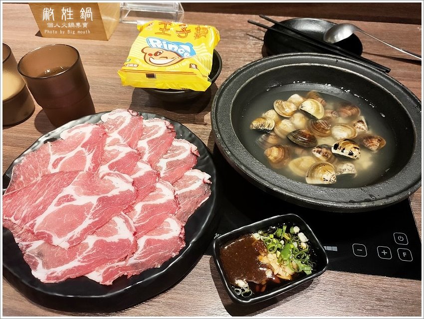 ▼大口點的獨家爆爆蛤蜊鍋,附餐同樣搭配的是王子麵,菜盤可以換成牛、豬、雞肉品三選一,我們則是換成豬肉,沒想到份量也不少!