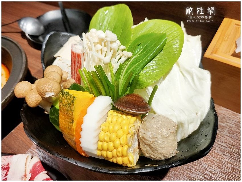 ▼菜盤,裡頭有各式各樣的當季蔬果,像是高麗菜、青江菜、水蓮、金針菇、玉米、山藥、胡蘿蔔、南瓜、大黃瓜、鴻禧菇、蛤蜊等等,火鍋料只有簡單兩樣,算是滿天然的!