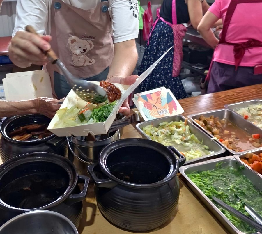 ▼配菜約有8~9樣,當天剛好一陣客人來訪,所以一道菜瞬間秒殺,但不用擔心~店家會再炒新的菜補上!來到這裡就是先拿裝好飯的便當盒開始裝菜,接著跟服務人員點主餐就對了~~不過裝好白飯的便當盒比較燙手,大家要稍微留意一下!