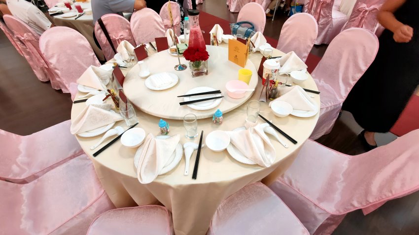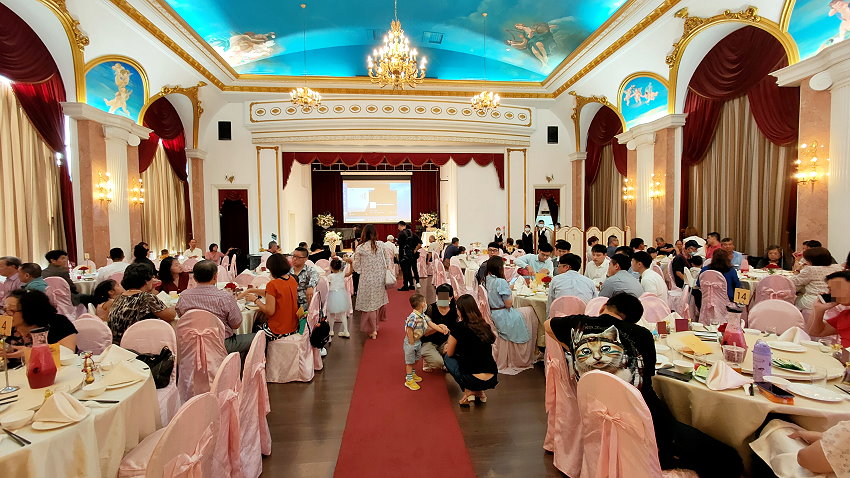 ▼這裡的桌數約有20桌上下,中間鋪有紅地毯,前方舞台也有設置投影幕,準備讓新人進場使用!不過這裡的圓桌、舞台感覺都滿迷你的XD坐滿的話應該也會有點擁擠~~