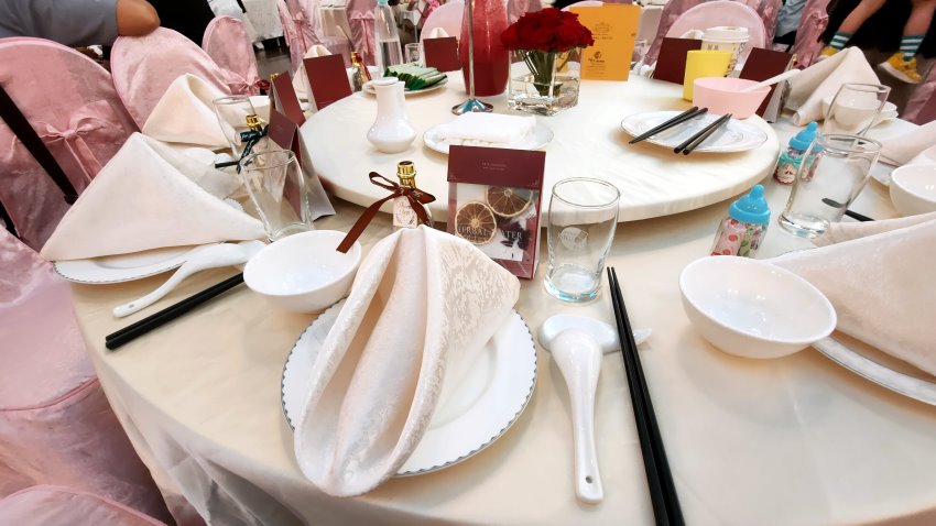 ▼每個座位都有餐具、水杯跟餐巾,桌上也會放有菜單及新人準備的小禮物!