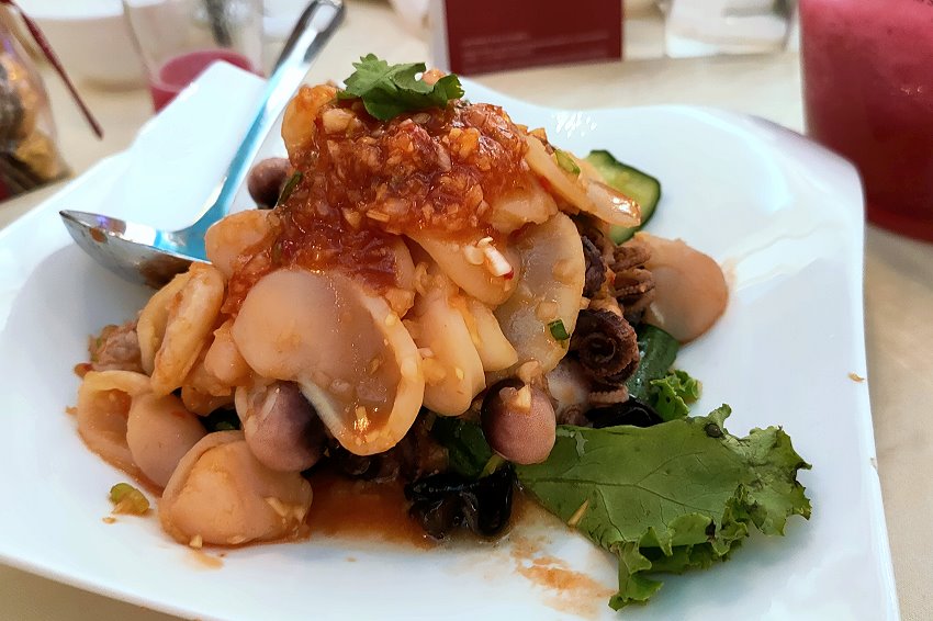 ▼腰子貝小目斗,裡頭有腰子貝、小章魚、小黃瓜、木耳等多種配料,拌上特製的醬料,吃起來有點類似帶有蒜味的五味醬,清涼爽口又開胃,也是我們很愛的一道!