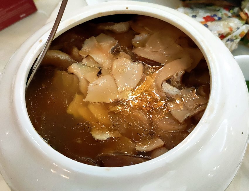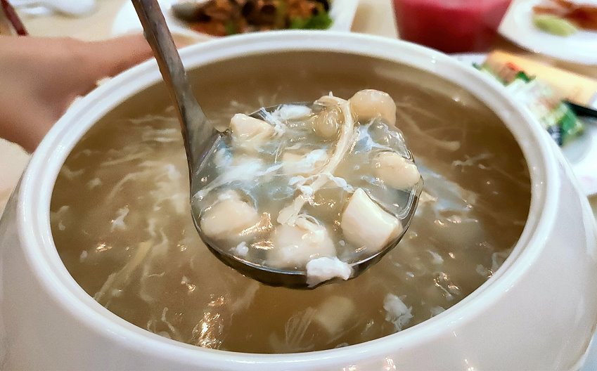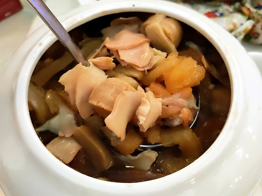 ▼湯頭採用老母雞大骨湯下去熬煮而成,裡頭有鮑魚、干貝、天山雪蓮、排骨、豬肚、雞肉、紅蔥頭、馬蹄、香芋、白果、栗子、杏鮑菇等多種配料,第一次看到料比湯還多的佛跳牆~可惜沒有炸鳥蛋啊啊啊啊XD但是湯頭也算是甘甜好喝,整體來說還是滿不錯的!