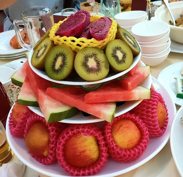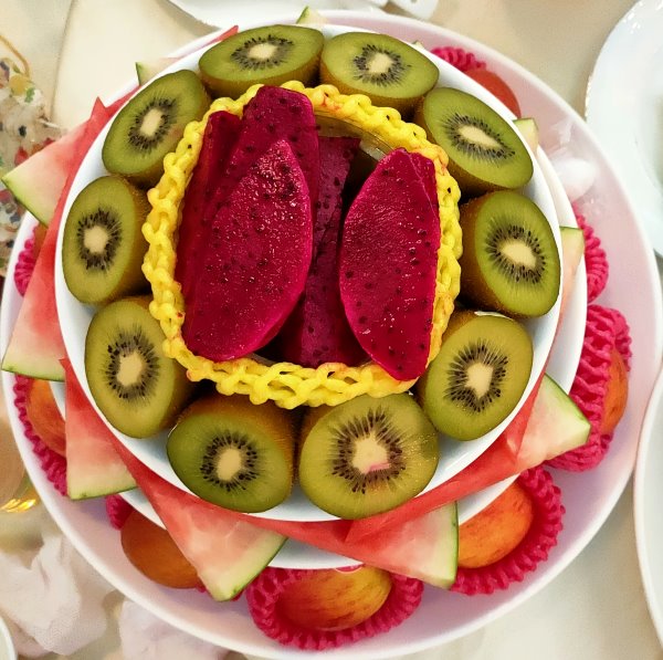▼金玉滿堂喜,也就是水果塔啦XD雖然已經知道南部辦桌的水果盤都這麼浮誇,但是每看到一次還是會驚嘆一次,真的是太猛啦!!除了有紅龍果、奇異果、西瓜、蘋果之外,西瓜中間的隙縫還塞了無籽葡萄,很方便小朋友享用(笑)~~不只擺盤大器,而且每一樣水果都是甜的,蘋果還可以直接外帶回家吃,真的很方便啊!