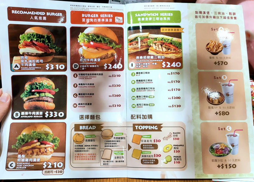 ▼菜單,有人氣推薦、夏威夷標準漢堡、三明治等選擇,也可以加價升級套餐,想要客製化的朋友也沒問題,大家可以選擇麵包、配料,做出自己喜愛的漢堡口味!