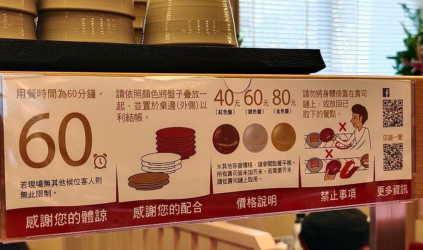 ▼這裡的用餐時間為60分鐘,如果沒有候位客人的話就沒有限制;價格的話也很簡單,紅盤40元、銀盤60元、金盤80元,其他不同價位的餐點在平板上也有標示,清楚明瞭!