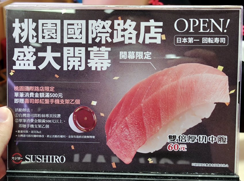 ▼這款雙倍厚切中腹是開幕限定款,特價只要60元,我們當然也要點來吃吃看!另外消費滿500元就能獲得壽司郎紅盤造型手機支架一個(數量有限,送完為止),雖然紅盤是平面的,但還是滿可愛的!