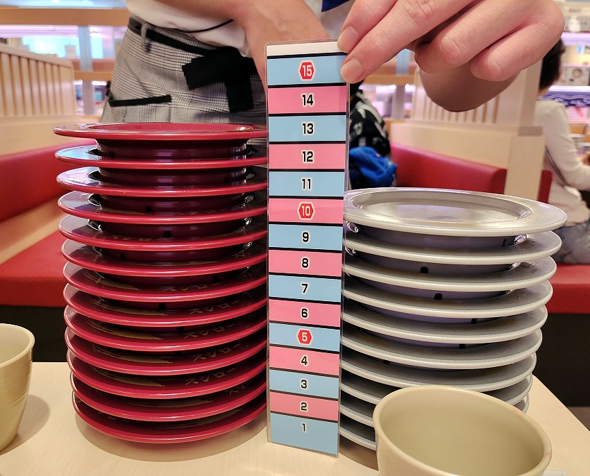 ▼最後要結帳前記得將同色的盤子疊好,方便服務人員計價!他們這時候就會拿出計價神器,一放上去對照就能知道吃了幾盤,整個很促咪!