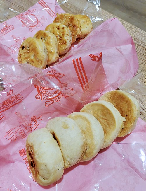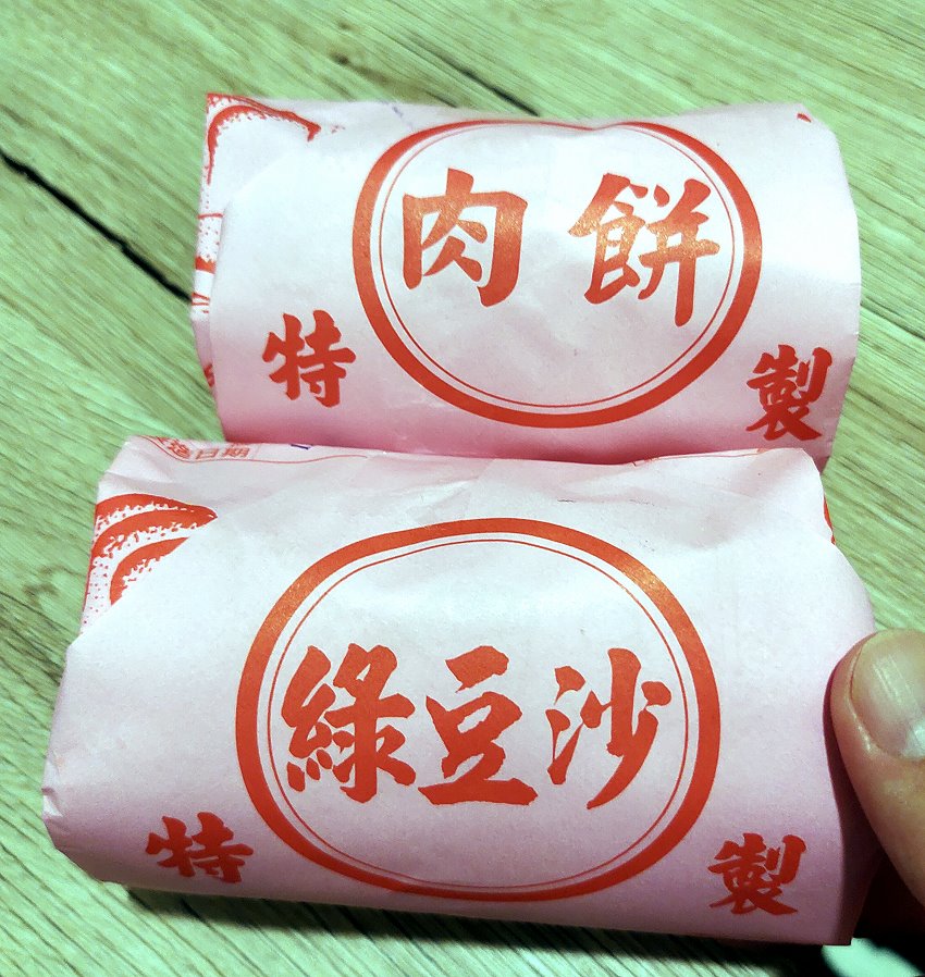 ▼我們買了招牌的綠豆沙口味與古早味肉餅兩款試試,包裝紙上就有標示口味,也不用擔心會搞混!