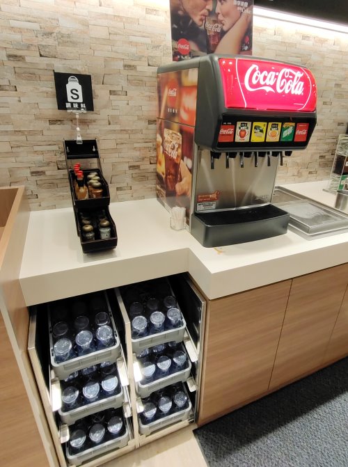 ▼飲料吧,這裡有提供各種氣泡飲品、果汁、茶、咖啡等,此外也有茶包可以泡熱茶,想要來杯冰咖啡就自行加冰塊,每個人只要49元就能喝通海~~~(2022改為50元)如果只想喝開水的朋友也可以來這裡自取(冰塊也可使用),包括調味料都是免費提供!