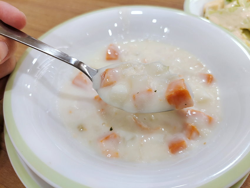 ▼限定餐點附的海鮮巧達濃湯,裡頭料多實在,喝起來滿濃郁的,小口愛喝得很開心(笑)!
