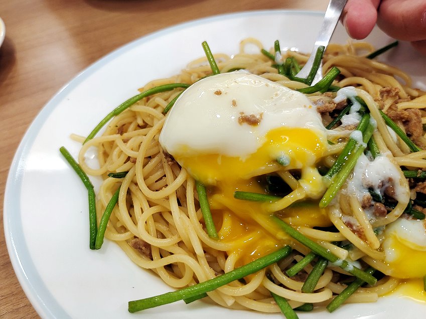 ▼半熟蛋香麻肉醬麵,採用椒麻肉醬、水蓮搭配義大利麵一起拌炒,再淋上初榨橄欖油,是期間限定的餐點,賣完為止!