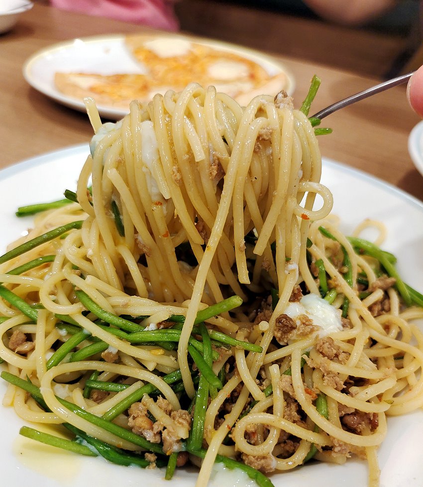 ▼義大利麵口感香Q有嚼感,比較偏青醬清炒的感覺,說好的奶油青醬呢(笑)~~~吃久了會有點偏乾,可惜了一點!
