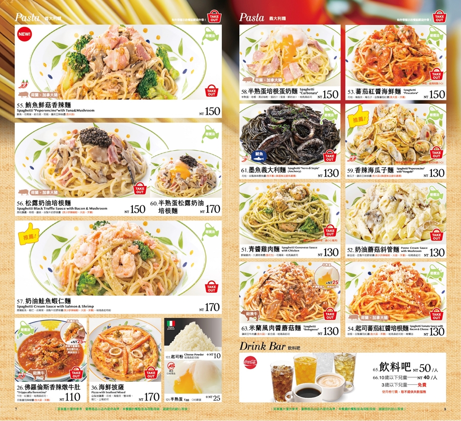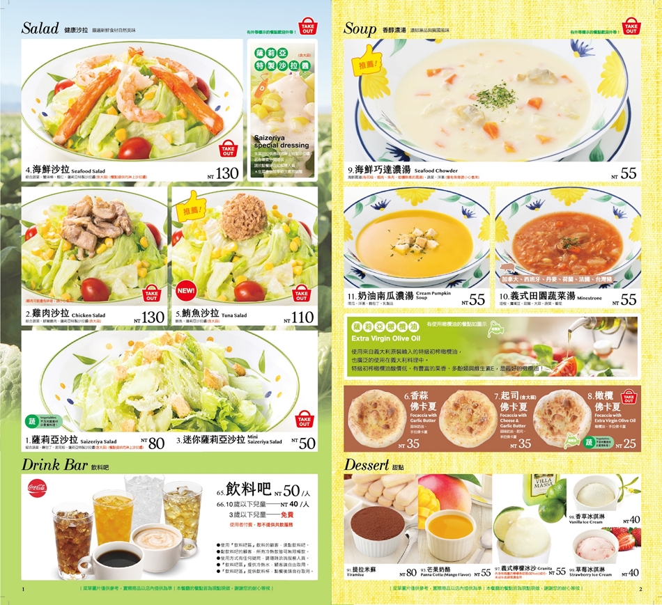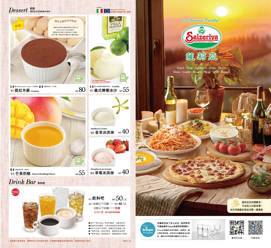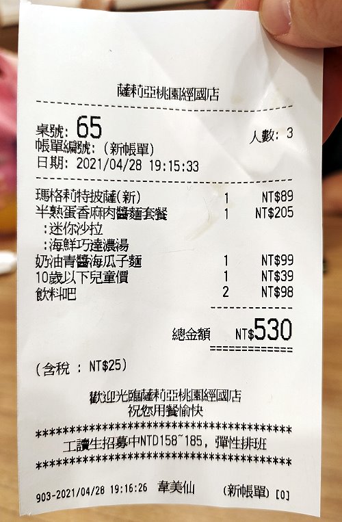 來自日本的「薩莉亞義大利料理」除了台北、新北之外,桃園也有三間門市,在桃園經國家樂福也吃得到啦!「薩莉亞義大利料理」主打平價路線,餐點選擇多元,像是義大利麵、燉飯、焗烤、前菜、沙拉、湯品、排餐鐵板類、甜點等通通應有盡有,飲料吧只要50元就能喝到氣泡飲品、果汁、咖啡、熱茶等,價格相當親民,還不收服務費,超佛心來著!我們當天兩大一小只吃了500多元,包括一個披薩、兩份義大利麵,還有沙拉、濃湯、飲料喝到飽,也是挺有飽足感,不管是來這裡開會、聚餐、家庭用餐或是下午茶、聊天解饞都很適合!(未滿十八歲請勿飲酒)