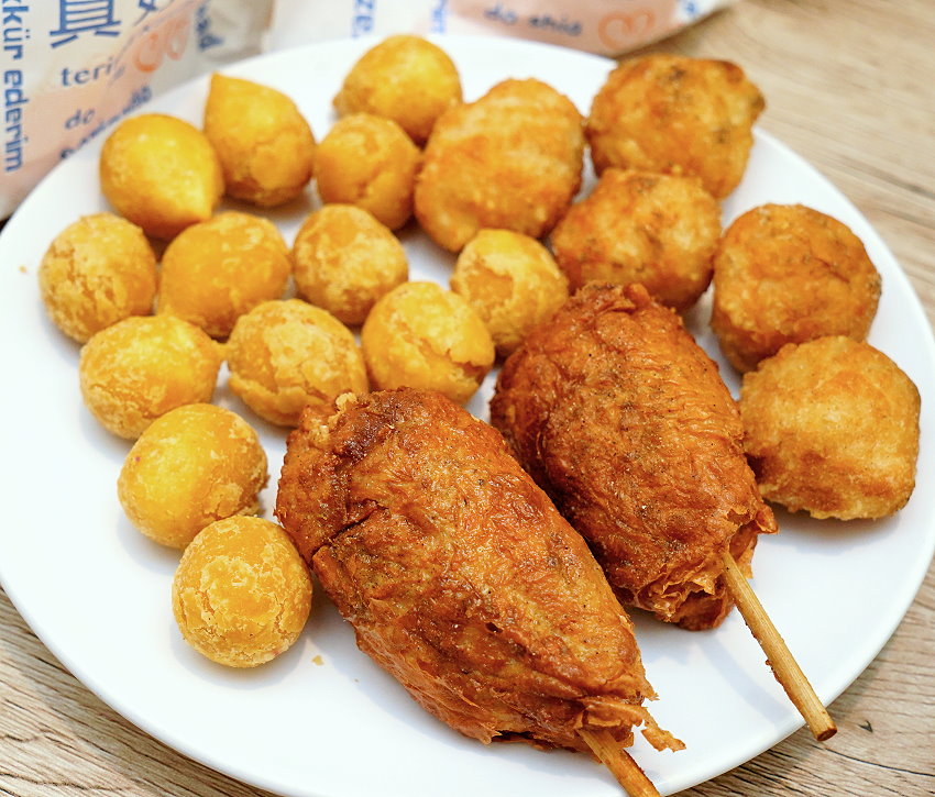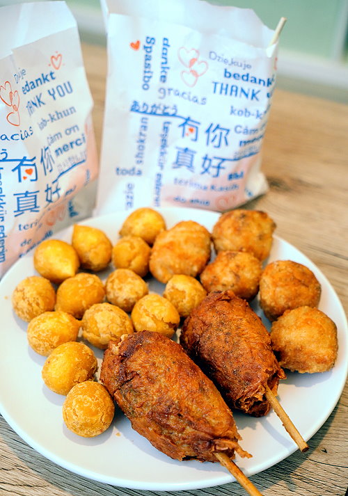 ▼我們還買了地瓜球、龍鳳腿、花枝丸,瞬間又裝滿一大盤!