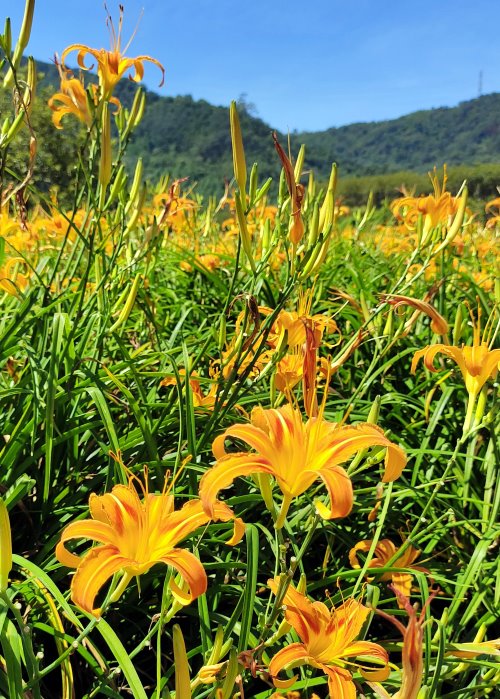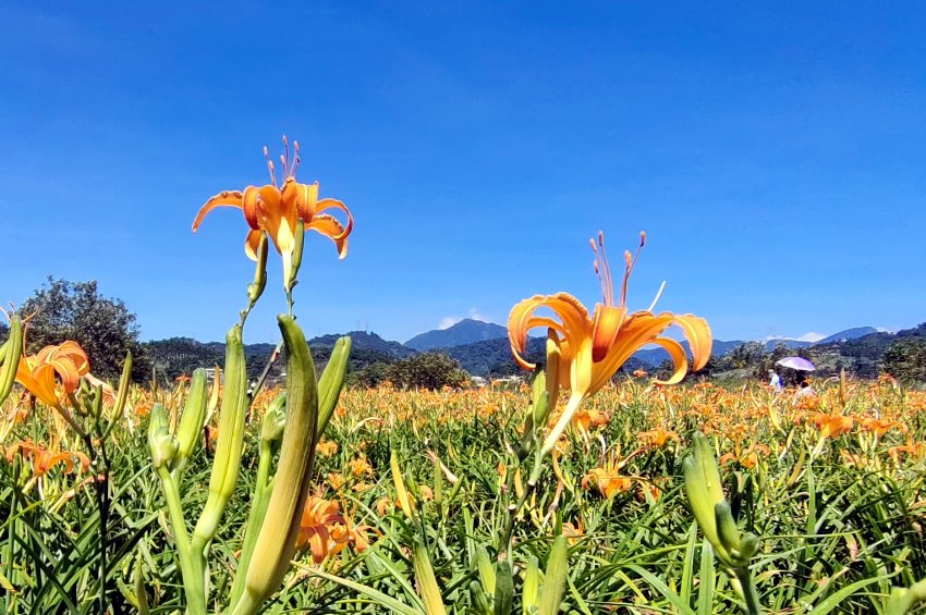 ▼這時候的金針花算是盛開期,所以只有少部份含苞,映著藍天、遠山,拍起來顏色超級美!