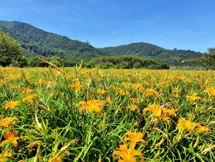 ▼滿滿的金針花就像是一大片的金黃地毯,搭配藍天、綠意,讓人心曠神怡啊!