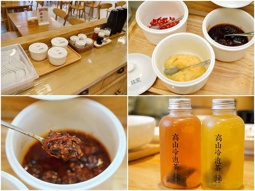 ▼這裡除了有白醋、醬油之外,也有提供豆鼓辣油、生辣椒、蒜泥等配料,其中豆鼓辣油採用屏東客家豆鼓搭配美人椒、指天椒、獨家香料等下去慢火細熬,香氣十足、鹹香帶辣的滋味,不管是搭配水餃或是麵食都很合拍~~我們另外又點了高山冷泡茶(青茶、紅茶)搭配餐點享用,清爽香醇又回甘,整個很解膩啊!
