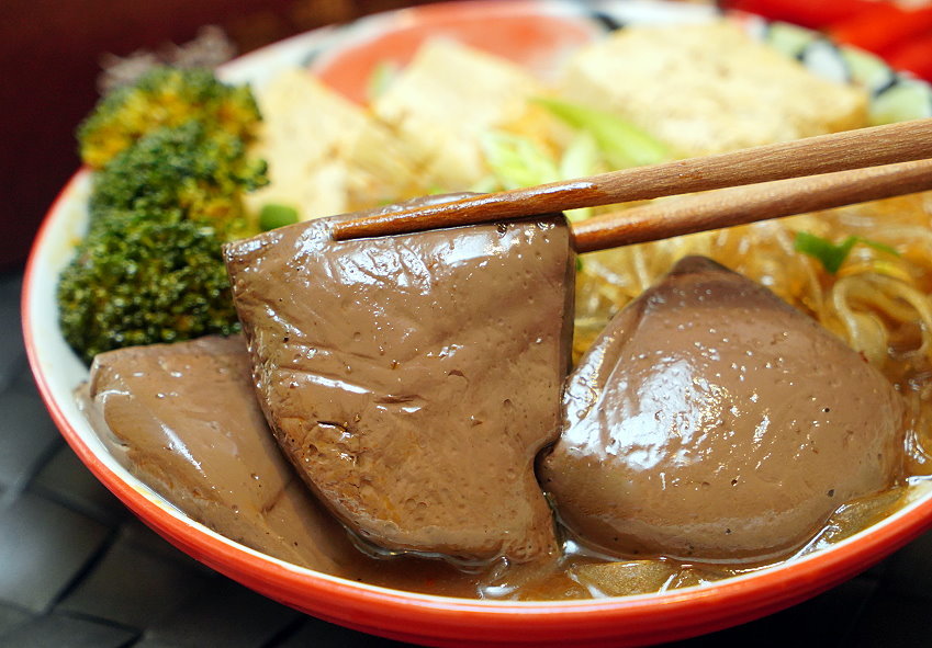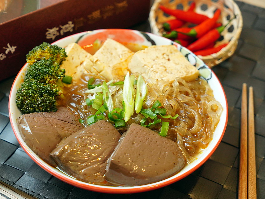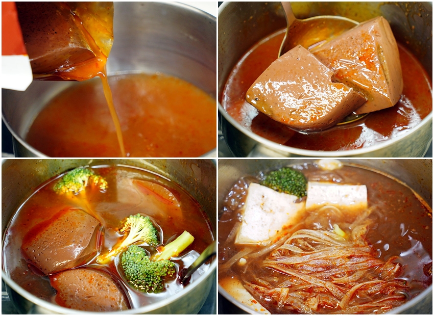 ▼我們採用直接加熱的方式,就可以加入其他配料及寬粉一起烹煮!打開一看,裡頭足足有三大塊厚切鴨血,我們又自行加了板豆腐、花椰菜下去一起烹煮,等到差不多熟透再加入寬粉稍微煮一下即可起鍋!