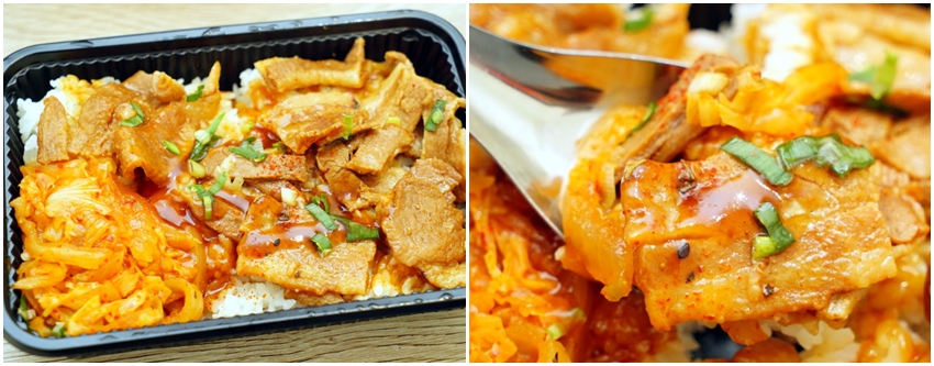 ▼一打開外盒就能聞到濃濃炭烤香氣,豬五花吃起來軟Q下飯,淋上微辣的特調醬汁相當開胃,搭配泡菜挺解膩的!