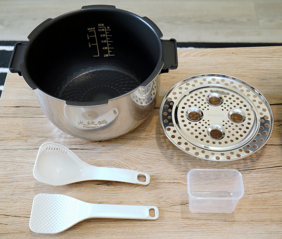 ▼贈品有不鏽鋼蒸架、湯勺、飯匙、量杯、食譜、食品級不銹鋼保溫內蓋、密封圈等,跟IP音速鍋的贈品差不多,不過價格可是相差3倍之多(笑)!