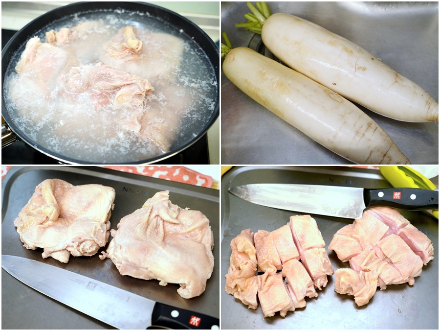 ▼我們準備了2條大蘿蔔(因為蘿蔔太大,後來只用一條)、6塊無骨雞腿排,平均每一鍋會有1/3條白蘿蔔跟2塊無骨雞腿排~~首先將無骨雞腿排切成小塊後先燙一下去除血水,等等就可以直接下鍋烹煮啦!