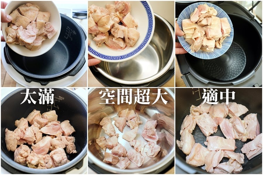 ▼以空間來說,Iris電子壓力鍋一下子就被雞腿排給鋪滿,IP音速鍋空間超大,放入雞腿排後還有不少空隙,感覺綽綽有餘啊~金小萬則是空間相對適中,放進雞腿排也滿剛好的!後來我們擔心Iris電子壓力鍋食材放太多,能放的水不夠多,還多分了半塊雞腿排給IP音速鍋(笑)!