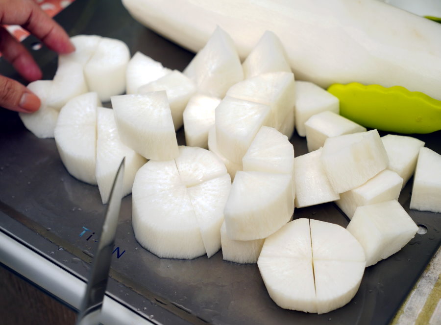 ▼白蘿蔔洗淨後去皮切成塊狀備用,記得皮要削厚一點,把外圍白色那一層都削掉,吃起來才不會苦苦的唷~