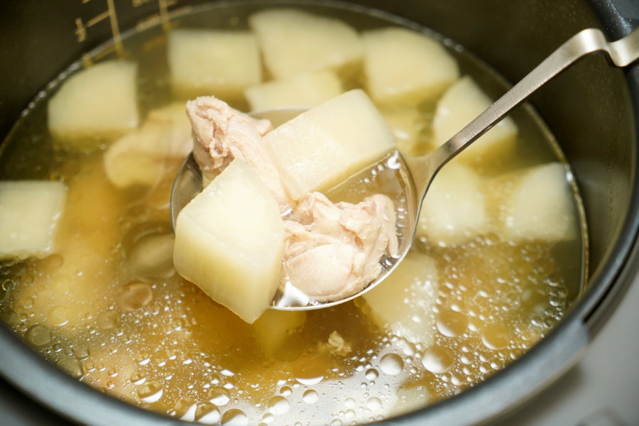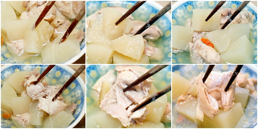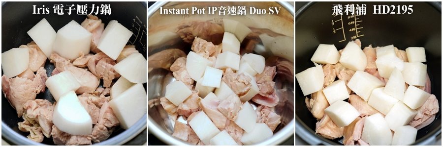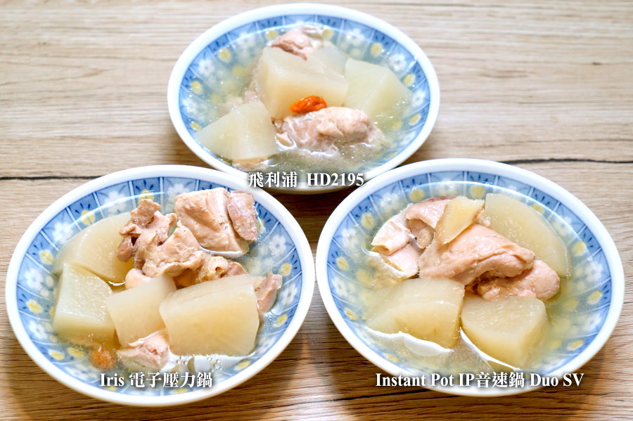 ▼基本上三碗配料吃起來的口感大同小異,用筷子都能很輕鬆的分離,雞肉也很軟嫩,很適合牙口不好的長輩、小朋友享用~如果要比較其中差異的話,Iris電子壓力鍋煮出來的蘿蔔味道比較沒這麼明顯,整體來說都比較清淡;IP音速鍋煮出來的蘿蔔就滿有味道,湯頭也不錯,金小萬則是湯頭更有味道,蘿蔔也帶點清甜滋味,基本上後兩者沒有太明顯的差異!