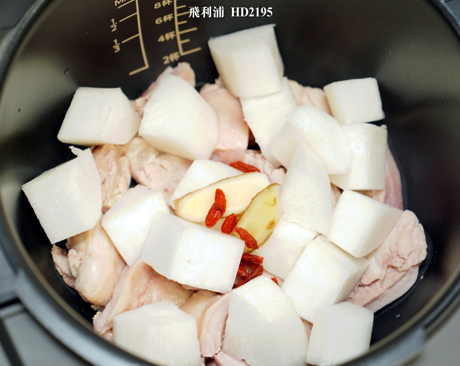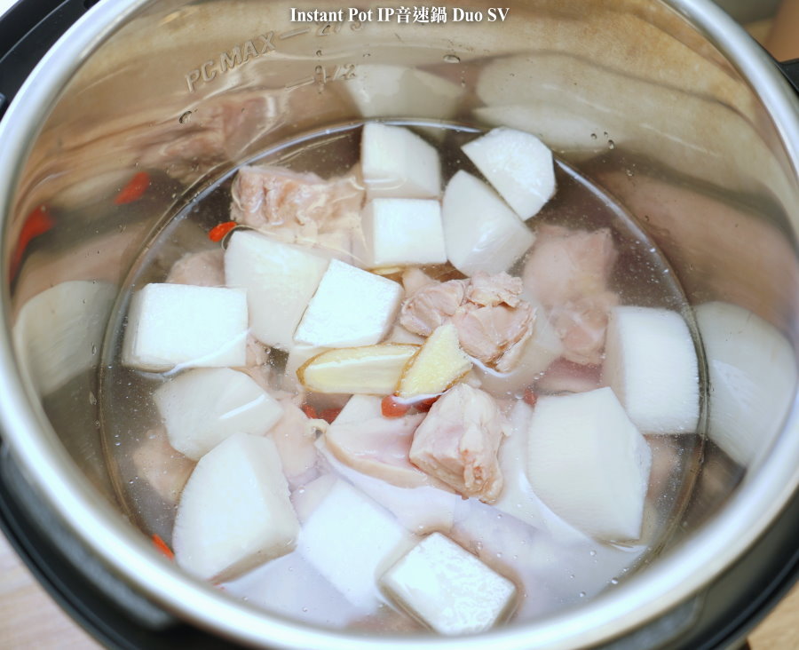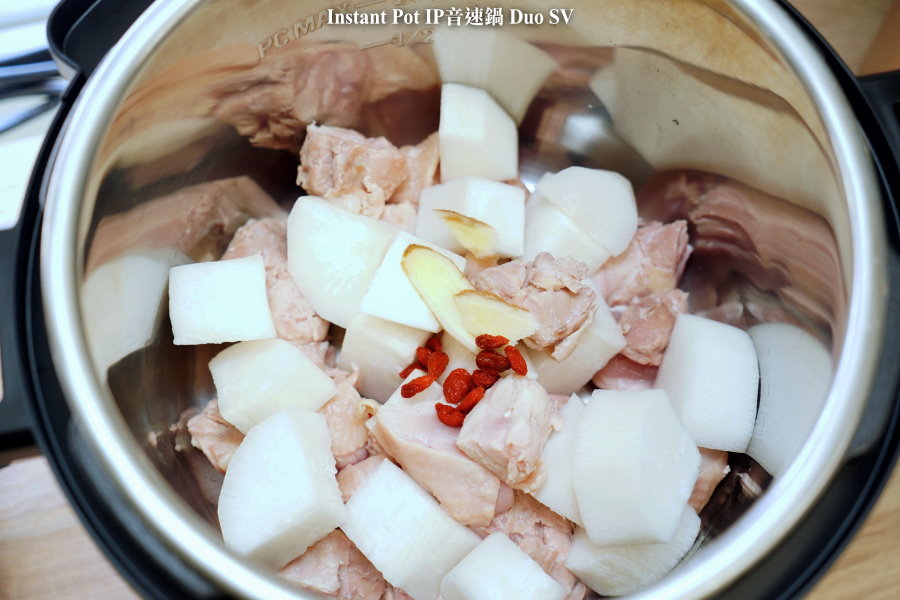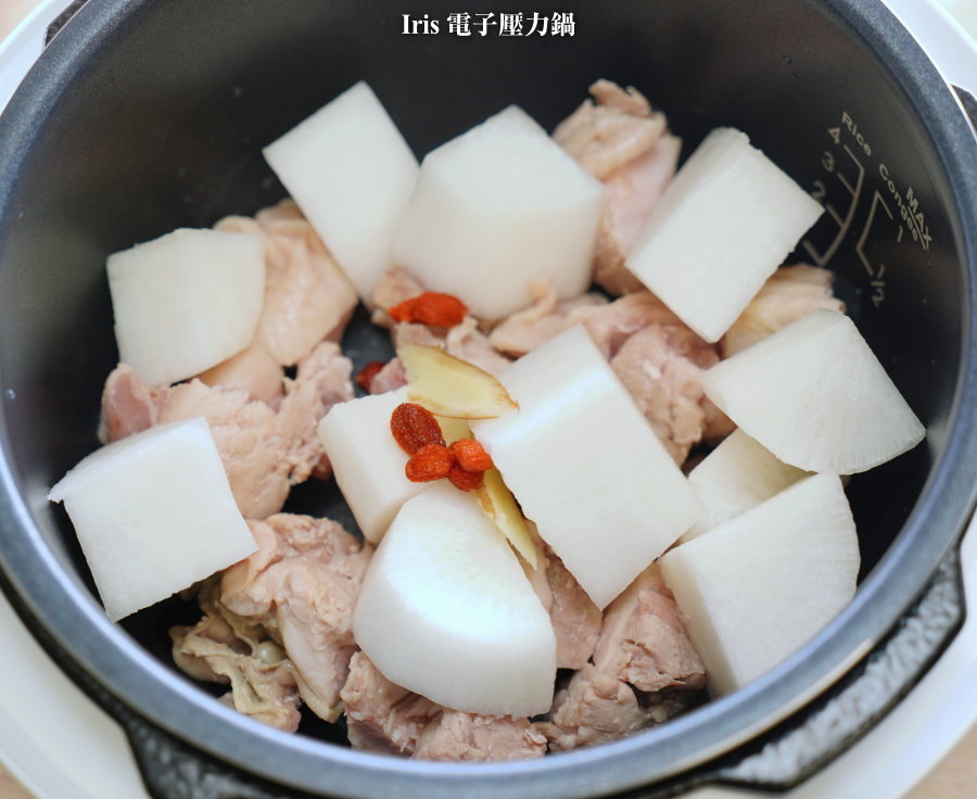 ▼IP音速鍋放完原本的配料後,還不到鍋子的一半,有極大的空間可以加水進去燉煮~後來又多放了Iris電子壓力鍋的部份雞肉與蘿蔔塊,也差不多是一半的位置!